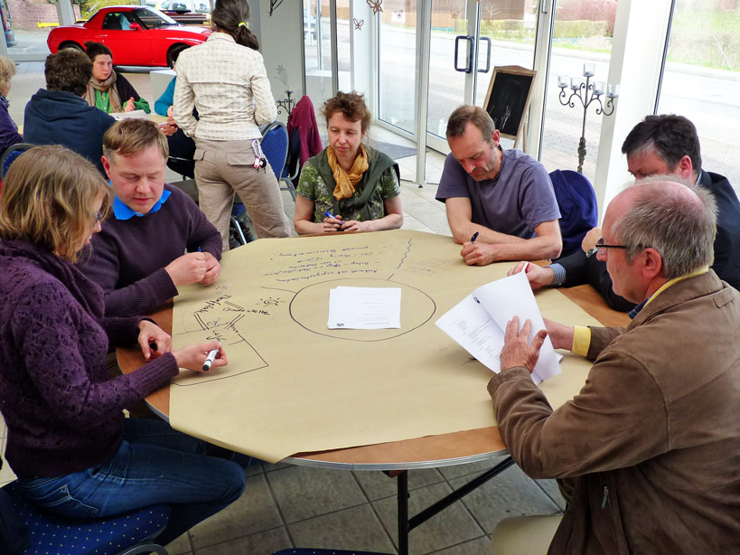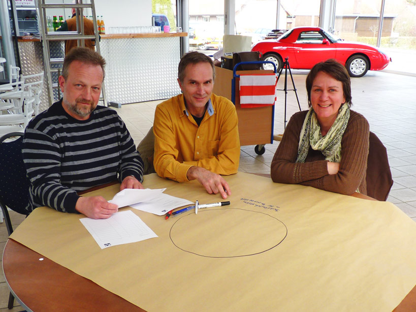 Aufgabe war es, die persönlichen Wünsche auf der Papier-‘Tischdecke’ aufzuschreiben, danach durch drehen alle Stichwörter am Tisch bekannt zu geben und schliesslich daraus das ‘Wichtigste’ auszuwählen.