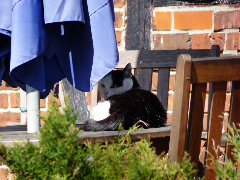 Da findet jeder sein Plätzchen ob Katz oder Maus. Der Wunsch ist groß nach sonnigen Stellen zum Sitzen und Plauschen – so auch hier an der kreativen Ecke bei Heimann in Tosterglope.