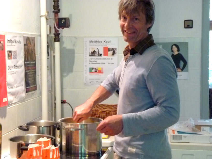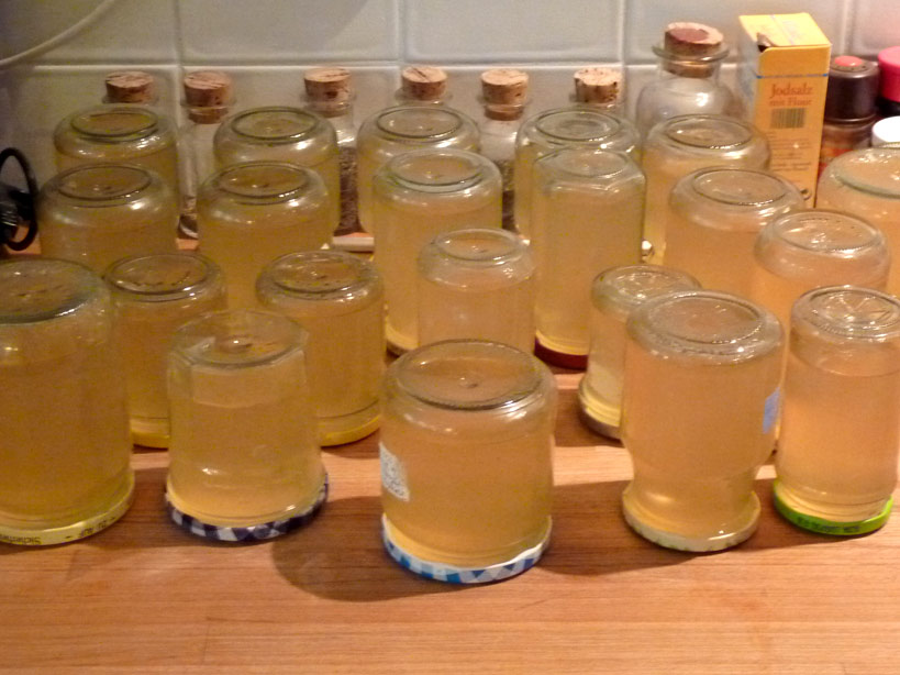 Zeit der Holunderblüte! Wir fangen also schon mal an mit dem was da ist: abends in der Küche kochten Raabe/Stephan das duftende Holundergelee für die Marmeladen-Tausch-Stände, die im Sommer in der Gemeinde aufgestellt werden.