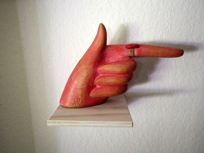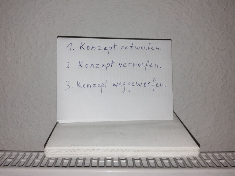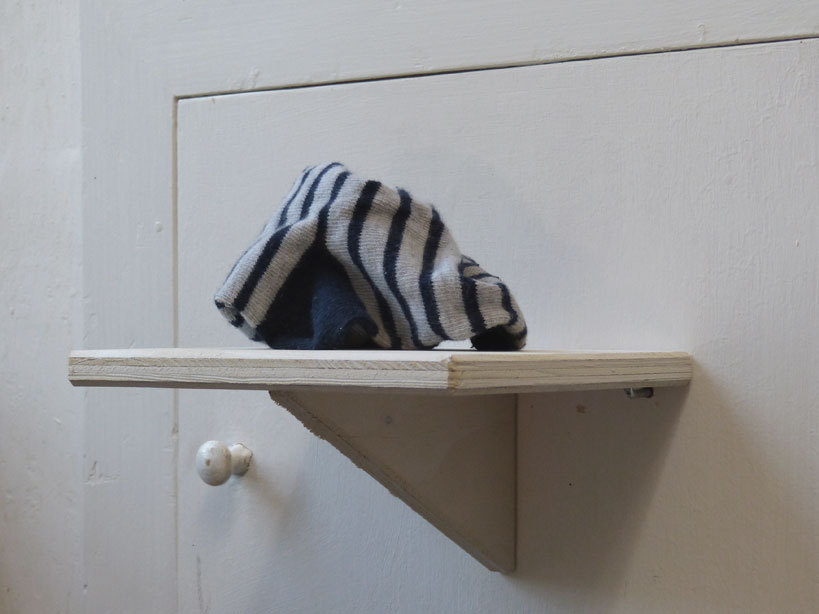 Nina Jansen: Jemand hatte einen Sockel an den Fensterladen geschraubt. Aber dann fehlte ja das Ausstellungsstück dazu. Ich fragte meinen Sohn Richard, ob er nicht etwas hätte. Er hatte ja auch die große Tasche dabei, aber es war überhaupt nichts drin. Lene dagegen hat immer etwas in ihrer Tasche. Ich hab zwar nicht damit gerechnet, aber si sagte: „Ja, ich hab was hier!“ und holte als erstes den Socken. Dann kam ja die Geschichte dazu, dass Piet sich den Socken über den Arm stülpte – was ist denn jetzt im Socken? Da ist der Arm drin. Und was ist jetzt außerhalb vom Socken? Das ist ja dann die Welt. Und wenn man jetzt den Socken umkrempelt, ist ja die Welt im Socken. Das ist jetzt die Weltausstellung im Socken.